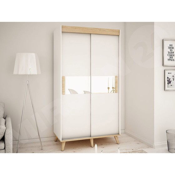 Posuvná skříň Bravo se zrcadlem dokonale ladí s interiérem zdobeným ve skandinávském stylu. Jednoduchý tvar skříně a skromný design dokonale zapadají do uspořádání obývacího pokoje, ložnice a předsíně. Díky položení na dřevěné nohy je skříň opticky světlejší a interiér je prostornější. Přidanou hodnotou je její funkčnost. Promyšlené uspořádání polic a šatních tyčí usnadňuje skladování oblečení a další zásuvky umístěné uvnitř skříně usnadňují skladování spodního prádla.