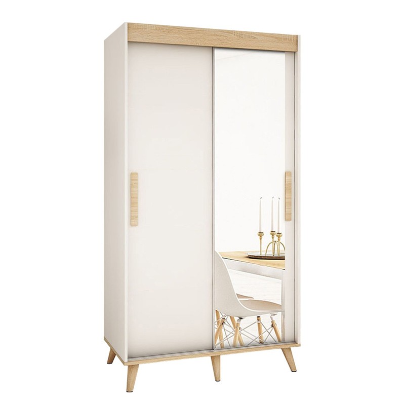 Posuvná skříň Bravo se zrcadlem dokonale ladí s interiérem zdobeným ve skandinávském stylu. Jednoduchý tvar nábytku a skromný design dokonale zapadají do uspořádání obývacího pokoje, ložnice a předsíně. Usazením na dřevěných nohách je skříň opticky světlejší a interiér je prostornější. Přidanou hodnotou skříně je jeho funkčnost. Promyšlené uspořádání polic a šatních tyčí usnadňuje skladování oblečení a další zásuvky umístěné uvnitř skříně usnadňují skladování spodního prádla.