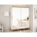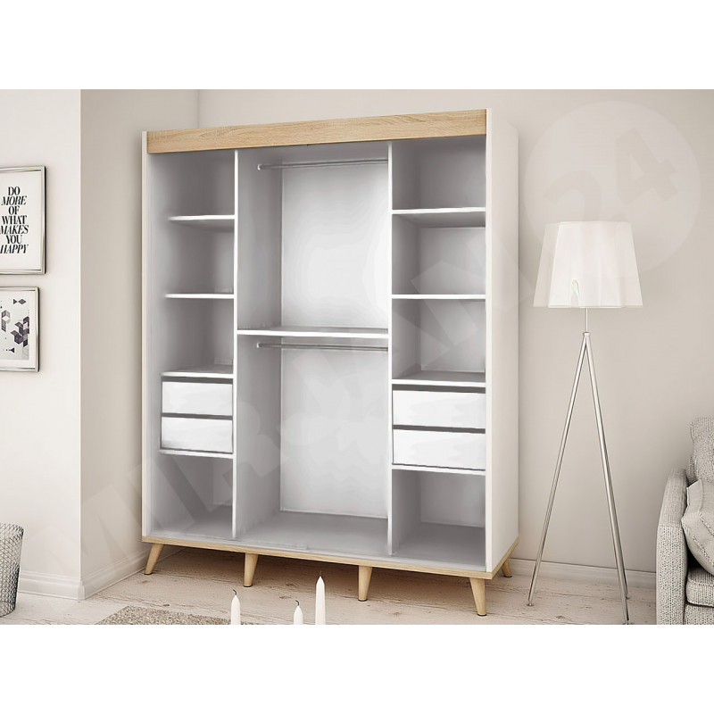 Skříň Bravo s posuvnými dveřmi kombinuje skandinávský design s funkčností, kterou očekáváme od skříně do ložnice, šatníku a obývacího pokoje. Jednoduchý tvar skříně byl obohacen o dekorativní prvky ve formě dřevěných úchytů a nohou. Světlá barva dveří je navíc zdobena zrcadlem a horní deskou v barvě přírodního dřeva. Tato harmonická kombinace dodá celému interiéru jedinečný vzhled a pokoji dodá eleganci a svěžest. Interiér skříně je plný polic, zásuvek a šatních tyčí.